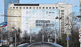 Жанровая фотография. Ситуация в зоне СВО. Плакат с надписью "Возрождаем Донбасс вместе!" банка ПСБ…