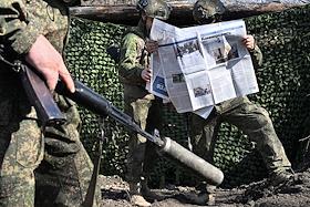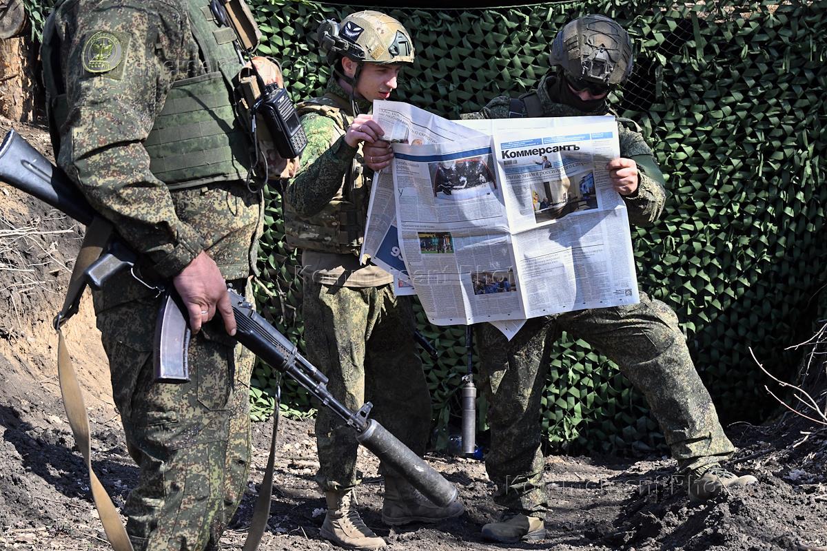 Жанровая фотография. Ситуация в зоне СВО. Бойцы во время чтения газеты "КоммерсантЪ" на блокпосту.