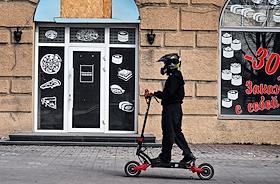 Жанровая фотография. Ситуация в зоне СВО. Мужчина в шлеме едет на электросамокате по улице города. …