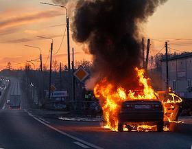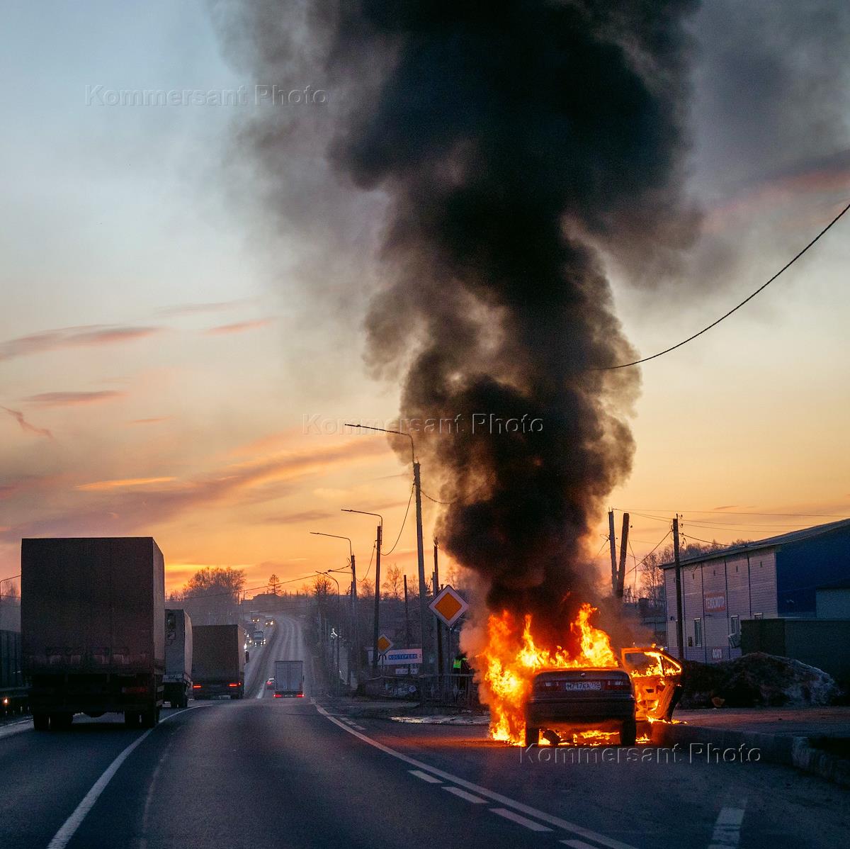 Горящий автомобиль иранского производства Khodro Samand на обочине автотрассы на территории…