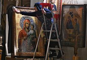 Свято-Успенский Николаевский женский монастырь. Монахиня протирает икону Богоматери в храме.