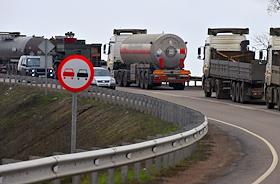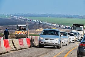 Жанровая фотография. Колонна автомобилей на дороге, скопившаяся из-за ремонта трассы.