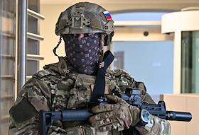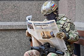 Жанровая фотография. Военнослужащий с оружием читает газету "Коммерсантъ".
