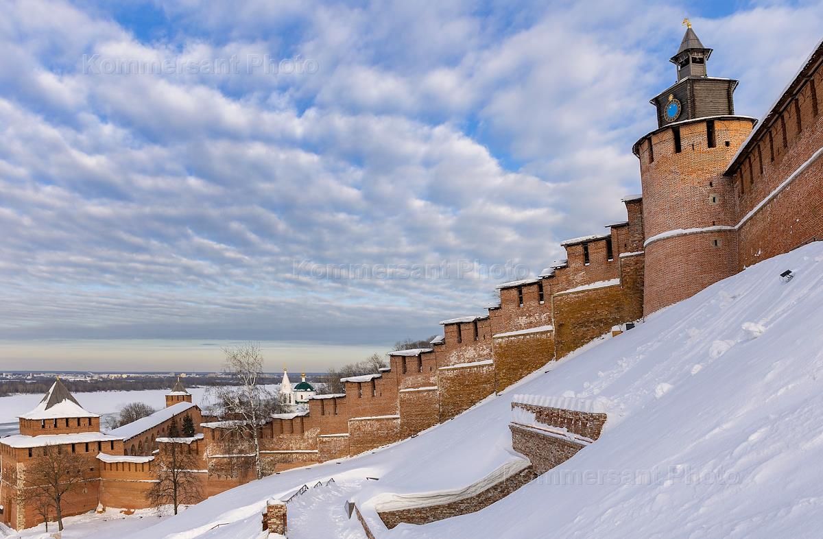 Виды Нижнего Новгорода. Крепостная стена и башня Нижегородского кремля зимой.