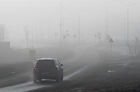 Жанровая фотография. Туман в городе. Автомобиль едет по трассе в тумане.