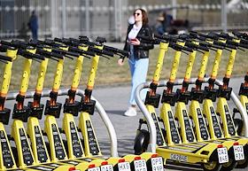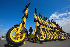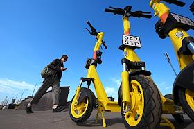 Электросамокаты в Москве. Жанровая фотография. Парковка электросамокатов "Яндрекс. Go" на Крымском…