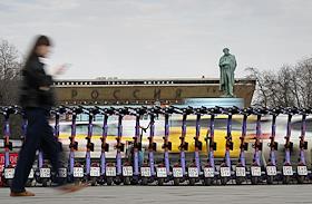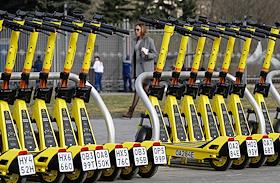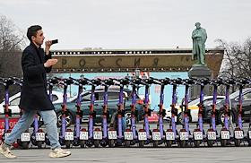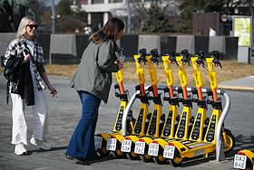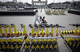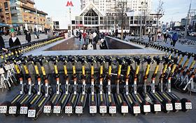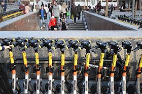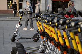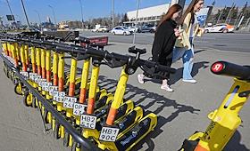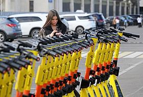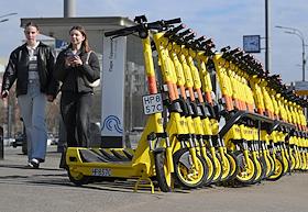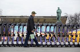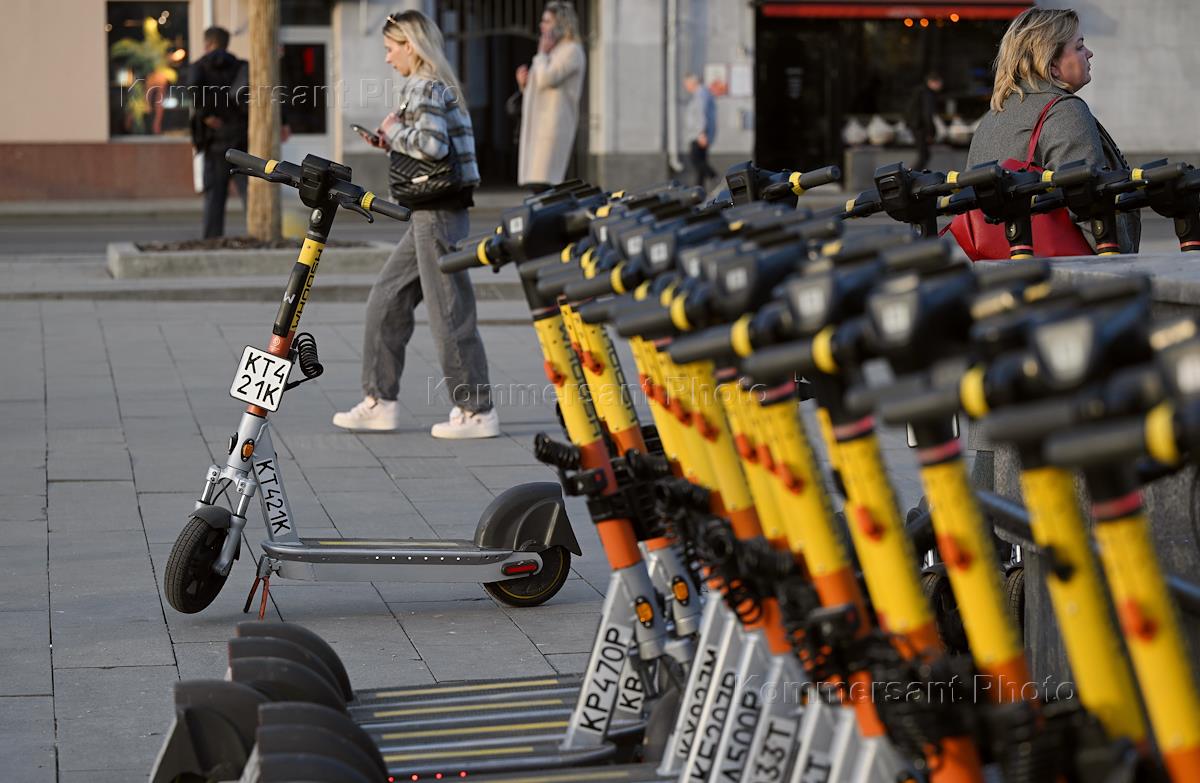 Электросамокаты в Москве. Жанровая фотография. Парковка электросамокатов "Юрент" на Пушкинской…