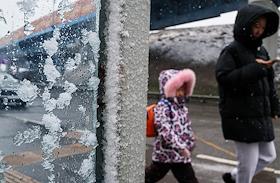 Жанровая фотография. Снегопад в городе. Женщины с детскими колясками и детьми идут по улице во время…