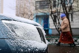 Жанровая фотография. Снегопад в городе. Припаркованный заснеженный автомобиль на улице города.