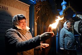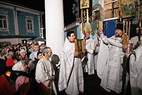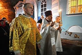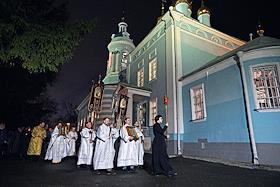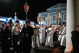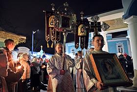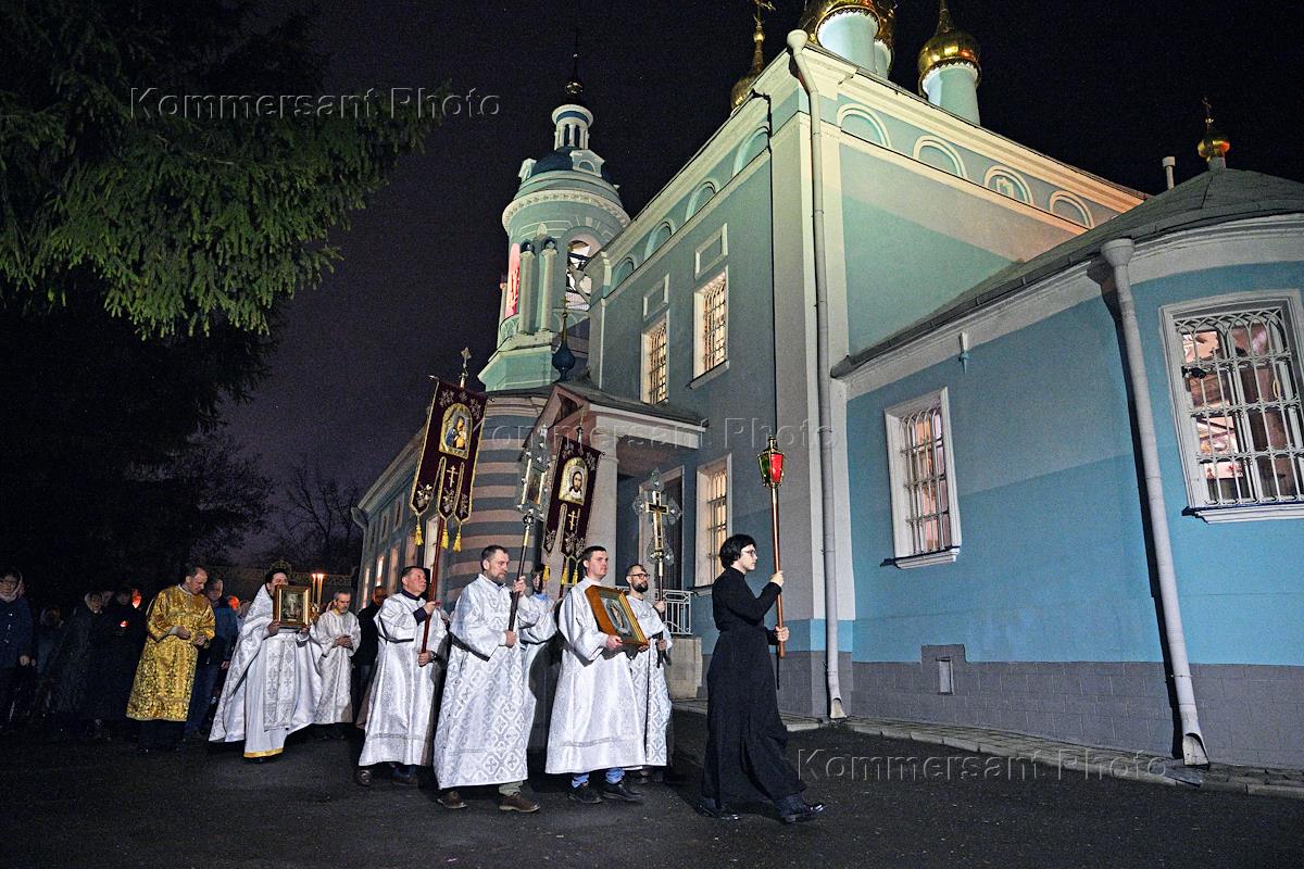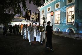 Праздничное Пасхальное богослужение в Богоявленском храме. Священнослужители во время крестного хода.