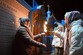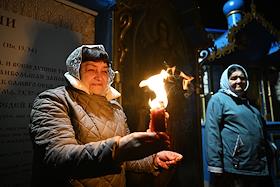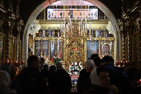 Праздничное Пасхальное богослужение в Богоявленском храме. Священнослужители и верующие во время…