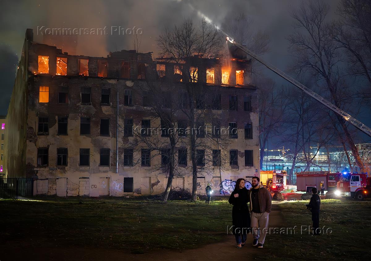 Пожар в заброшенном здании на проспекте Обуховской обороны, 42. Сотрудники противопожарной службы…