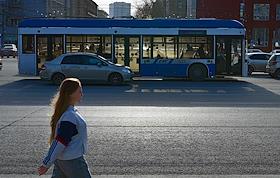 Виды Новосибирска. Жанровая фотография. Пешеход, автомобиль, троллейбус на улице города.