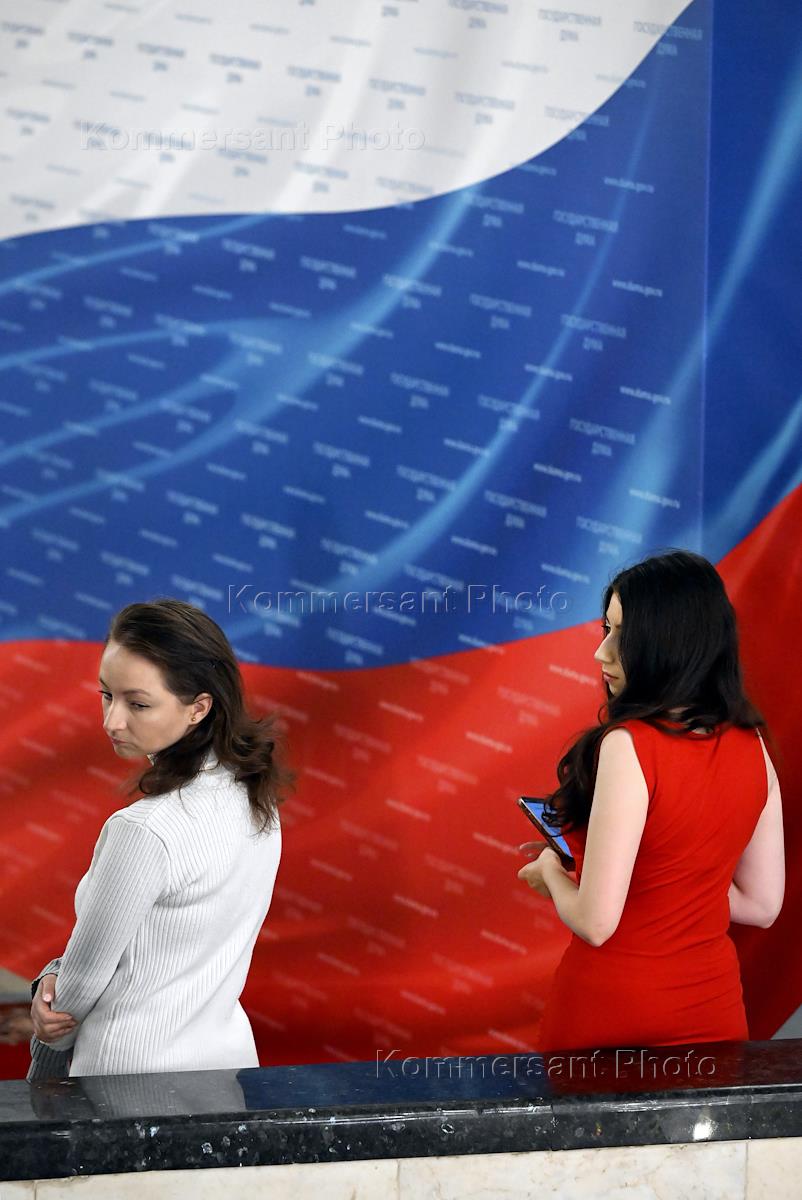 Пленарное заседание Государственной думы (ГД) России. Жанровая фотография. Девушки в фойе здания ГД…