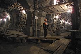 В шахте метрополитена, где проводятся работы по восстановлению линии метро поврежденной размывом.