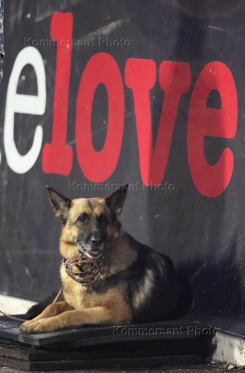 Чемпионат России по футболу. Премьер-Лига. 30-й тур. Милицейская собака несет службу во время матча…