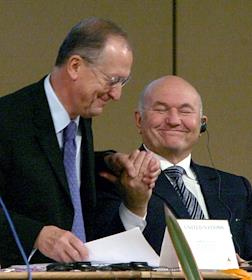 Мэр Москвы Юрий Лужков (слева) и министр иностранных дел России Сергей Лавров (справа) на Глобальном…
