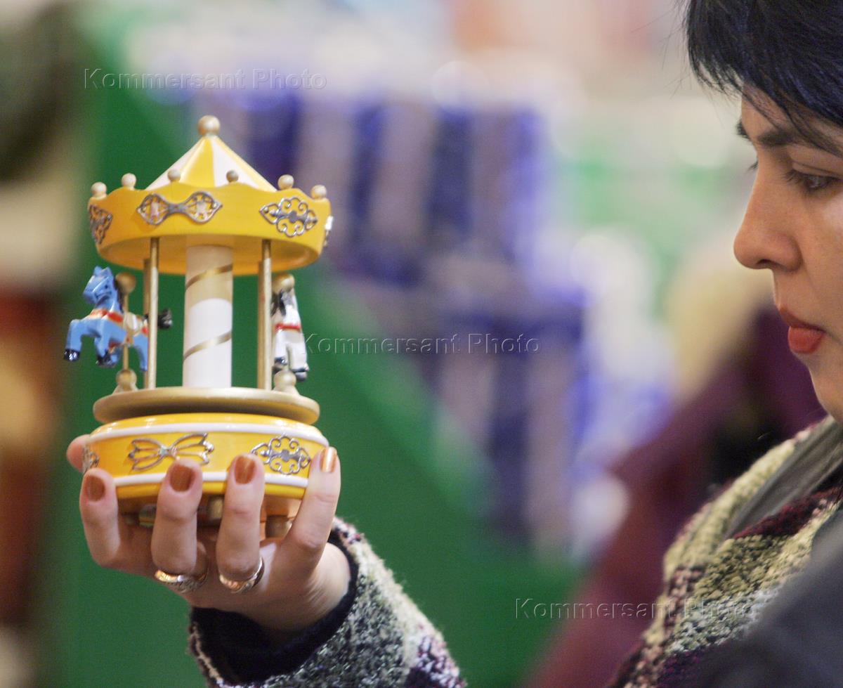 Покупательница выбирает новогодние игрушки в универмаге "Детский мир".