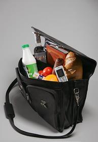 Портфель наполненный продуктами, книгами и мобильным телефоном.