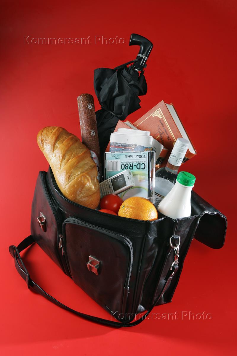 Портфель наполненный продуктами, книгами, зонтом, CD дисками и мобильным телефоном.