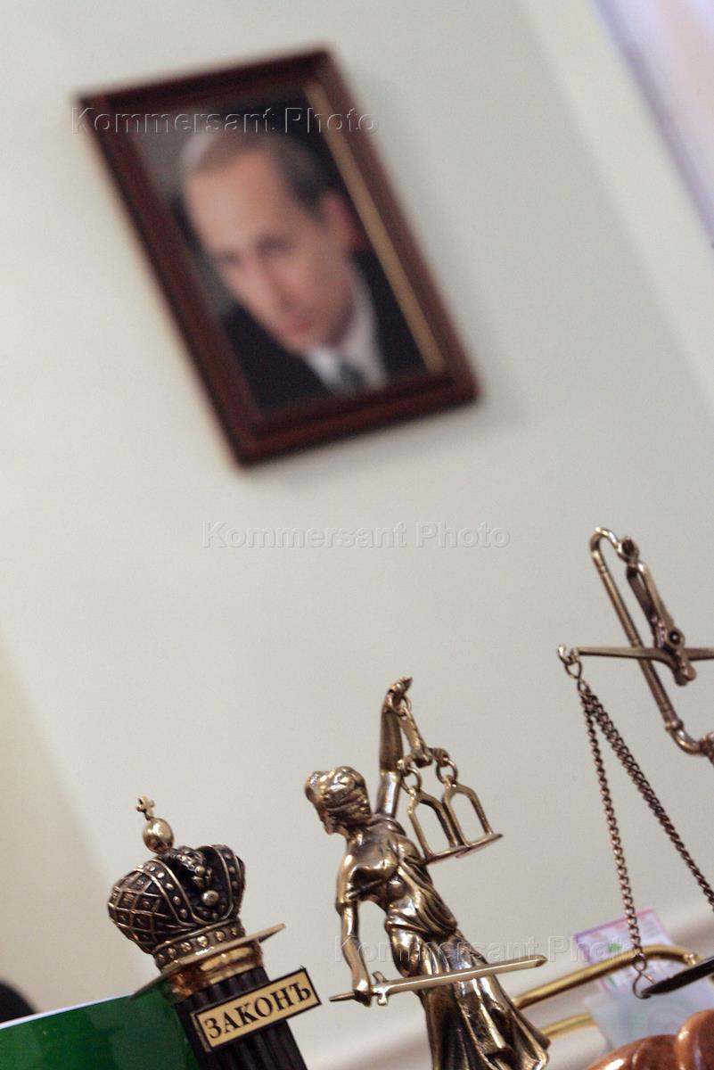Портрет Президента России Владимира Путина на стене и символы закона и правосудия на столе в…