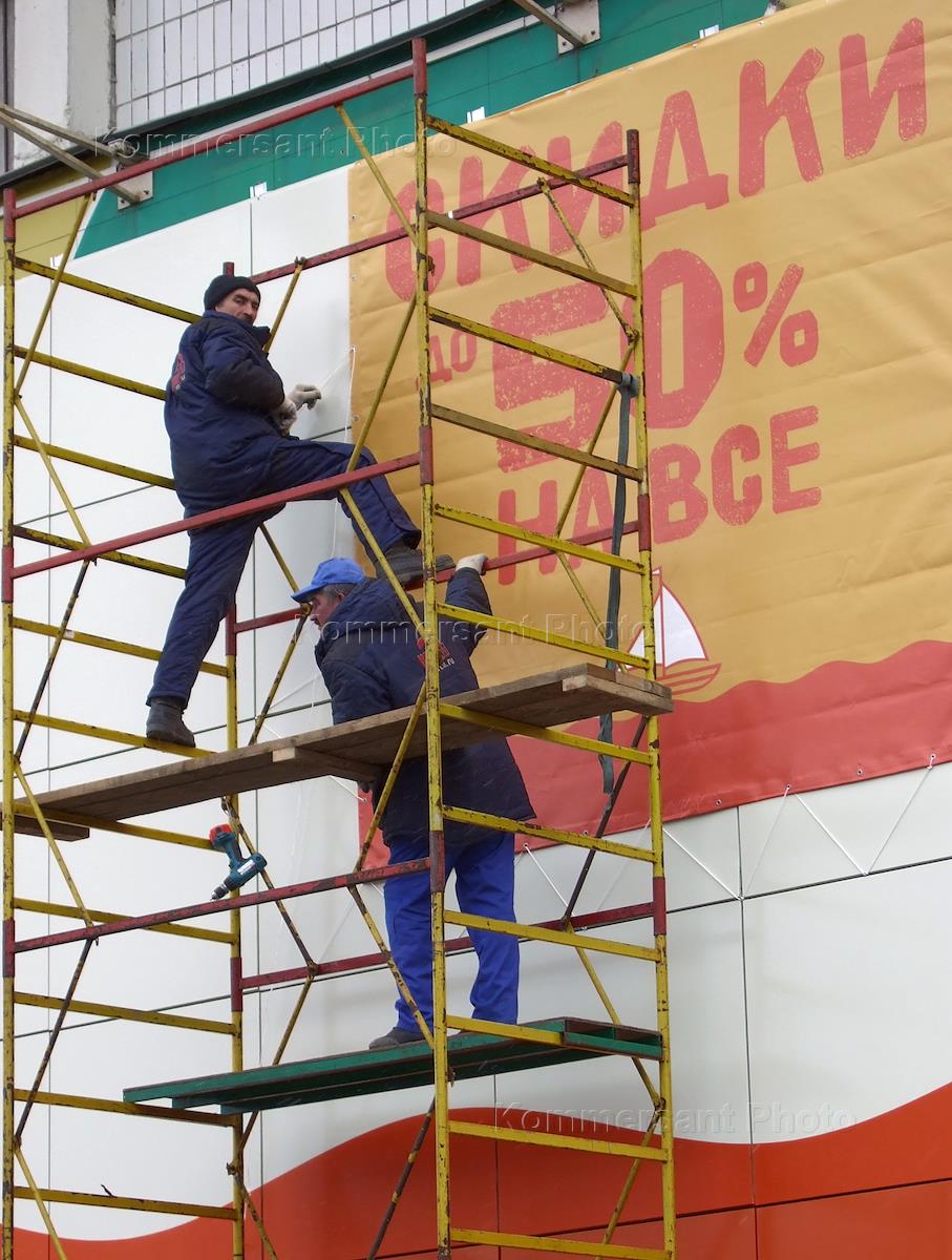 Сезонная распродажа в бутиках "Max Mara" и "Kenzo". Рабочие вывешивают плакат "Скидки до 50 % на…