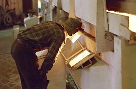 Искры расплавленного металла сыплется на рабочего в литейном цехе Череповецкого металлургического…