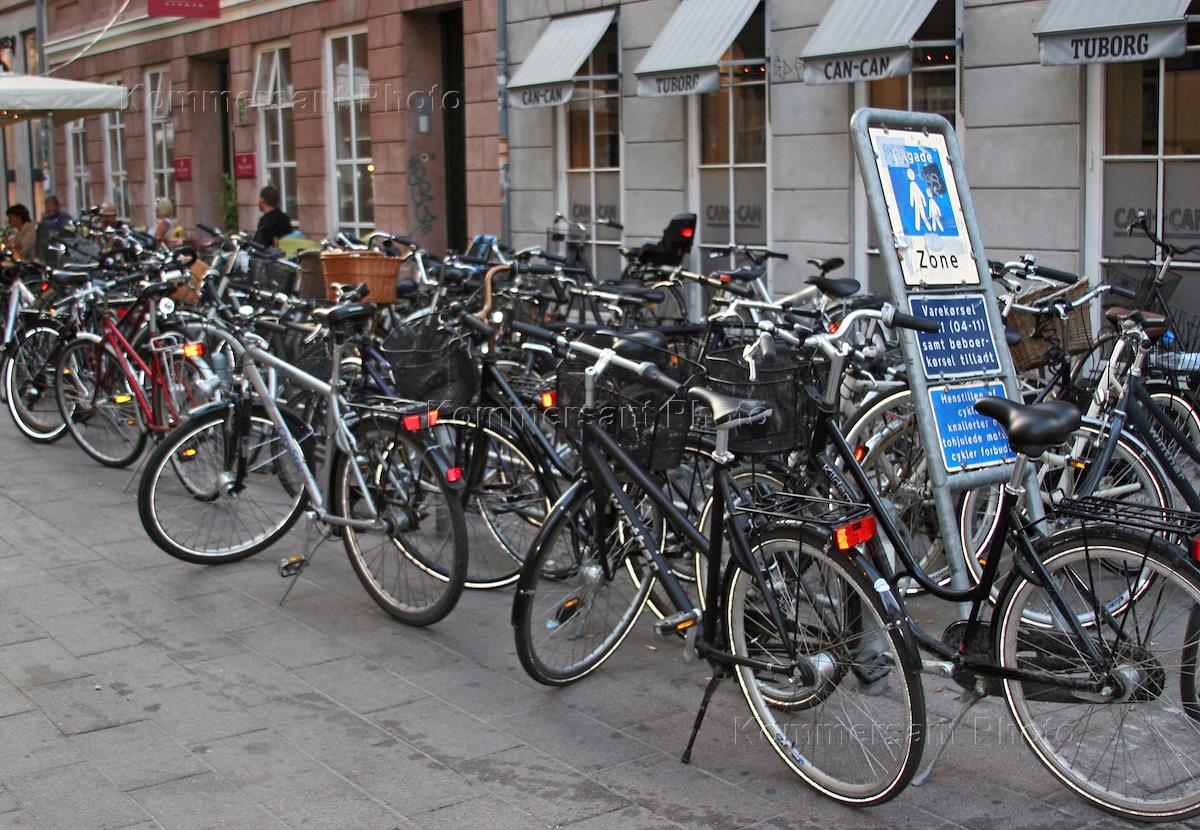 Виды Копенгаген. Припаркованные велосипеды на одной из улиц города.