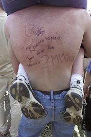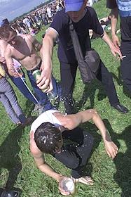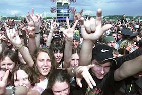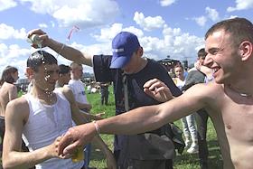 В жаркий день зрители поливают друг друга пивом во время Второго музыкального рок-фестиваля…