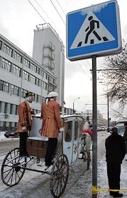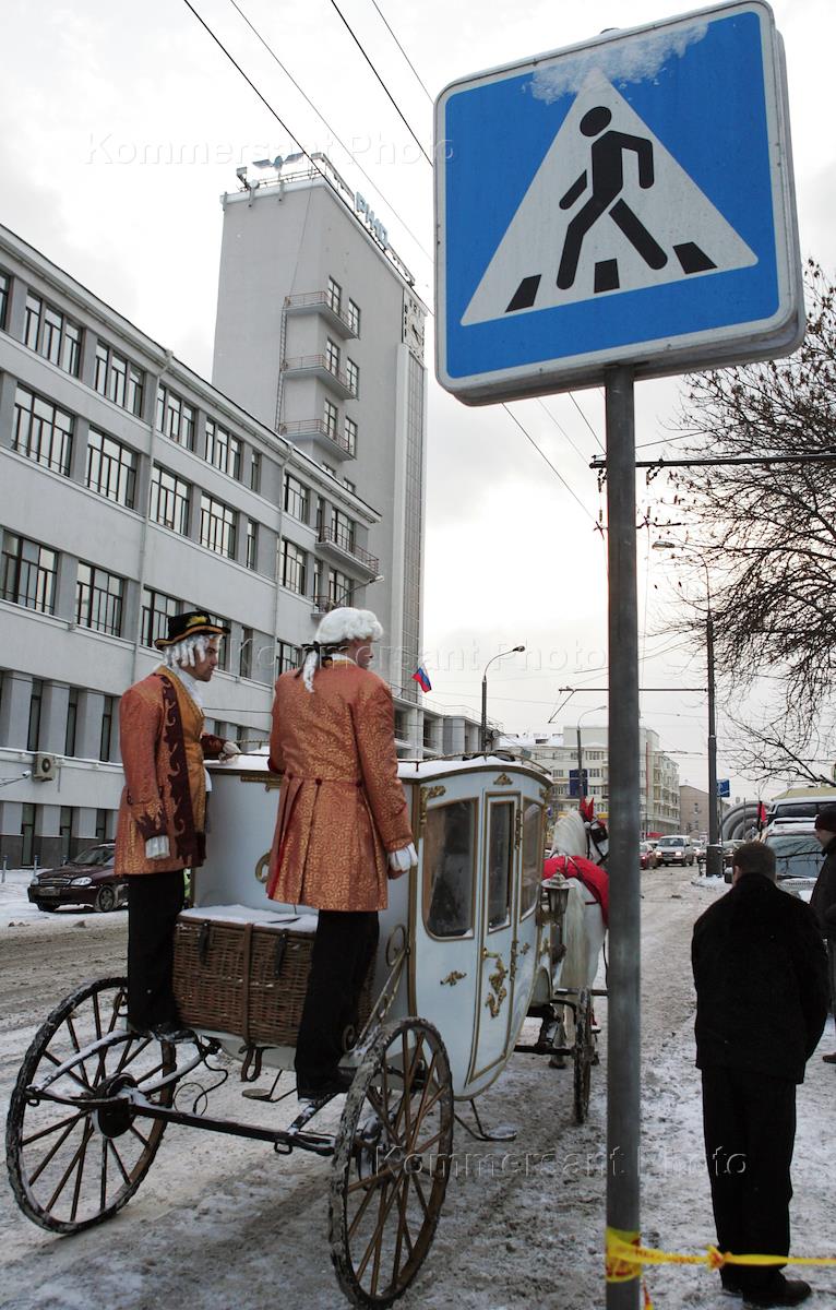 Карета у дорожного знака "Пешеходный переход". Главный офис ОАО "Российские железные дороги" на…