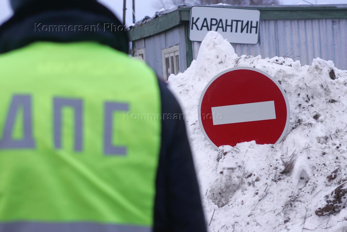 Сотрудники Дорожно-патрульной службы (ДПС) проверяют автомобили на въезде в деревню "Павловское"…