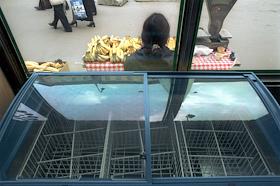 Жанровая фотография. Пустой прилавок-холодильник в магазине после августовского кризиса 1998 года.…