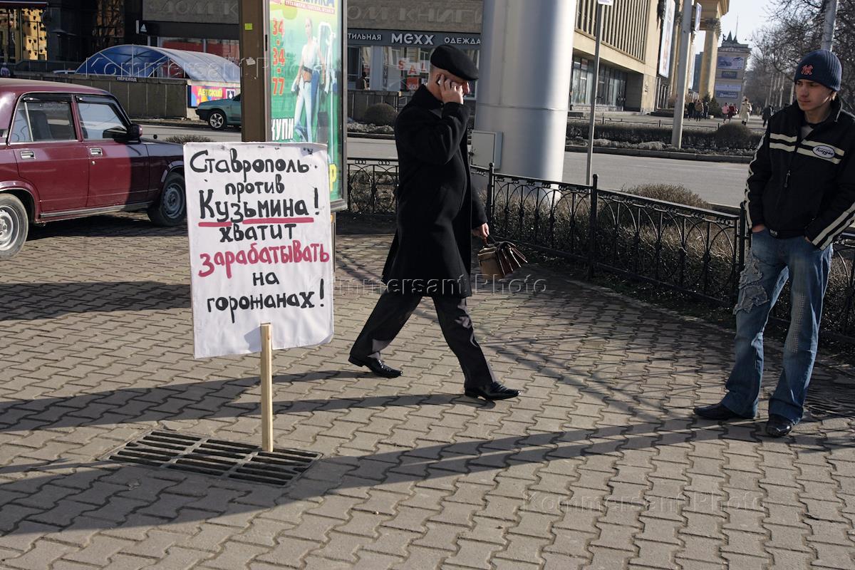 Плакат "Ставрополь против Кузьмина! Хватит зарабатывать на горожанах!" на улице города Ставрополя.