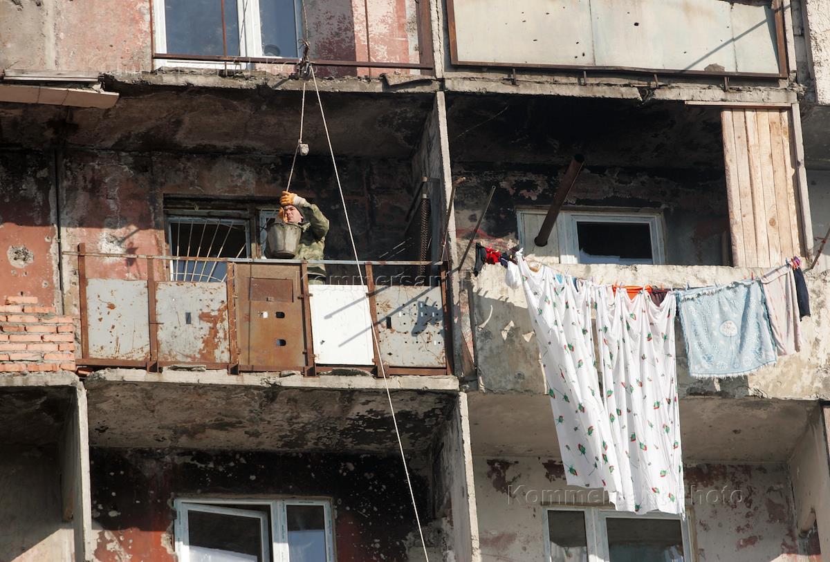 Женщина поднимает ведро с водой на свой балкон для мытья окон.