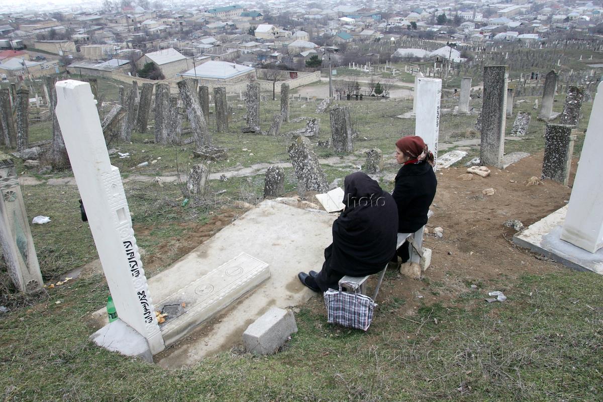 Выборы депутатов Народного Собрания Дагестана. Жанровая фотография. Женщины сидят у могилы на…