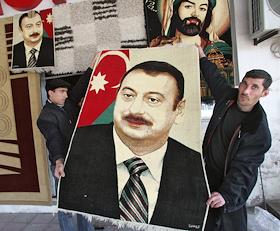 Продажа ковров. Продавцы демонстрируют ковер с портретом президента Азербайджан Ильхама Алиева.