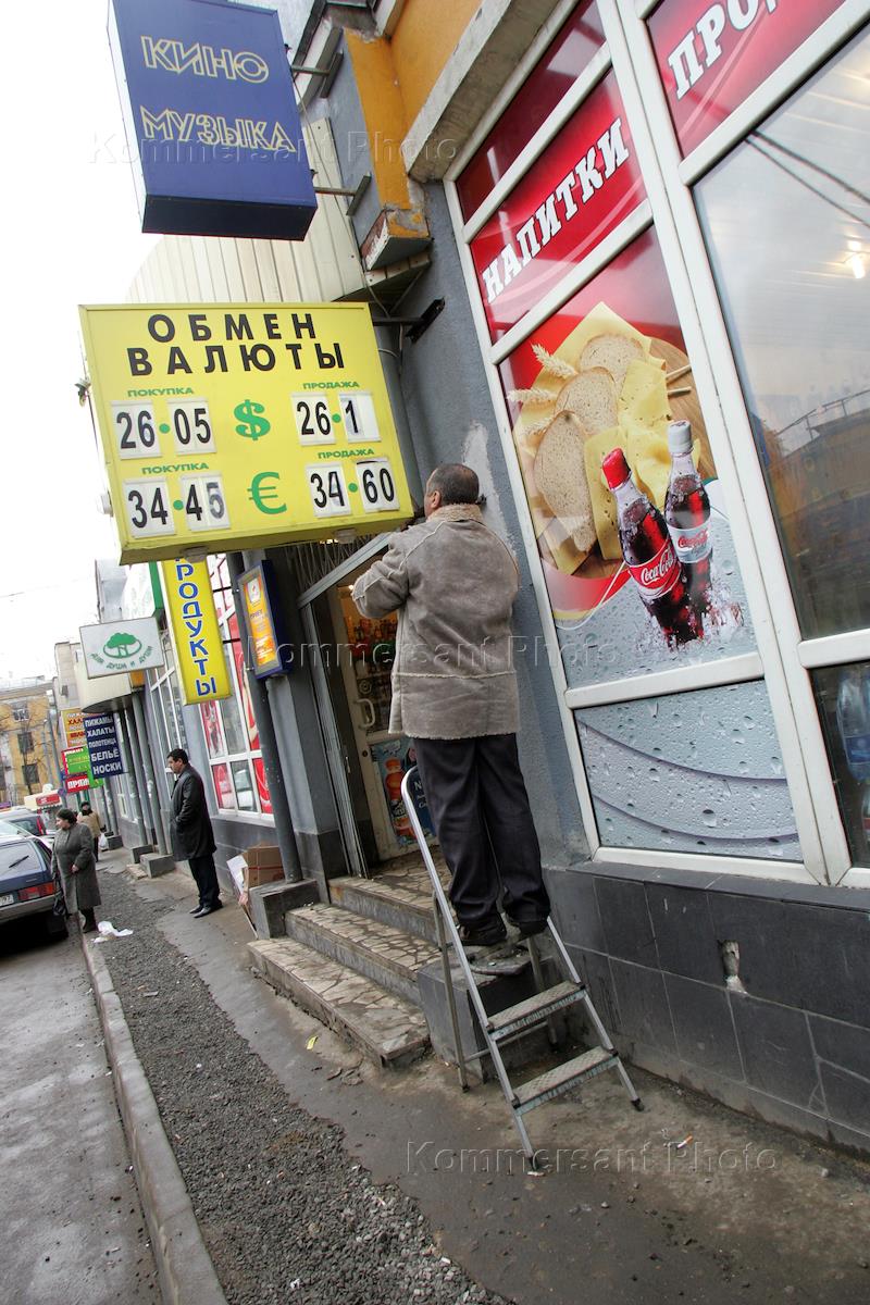 Сотрудник пункта обмена валюты меняет цифры на вывеске, указывающей курс иностранной валюты.