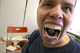 Гример демонстрирует зубы вампира в гримерном цехе киностудии "Мосфильм".