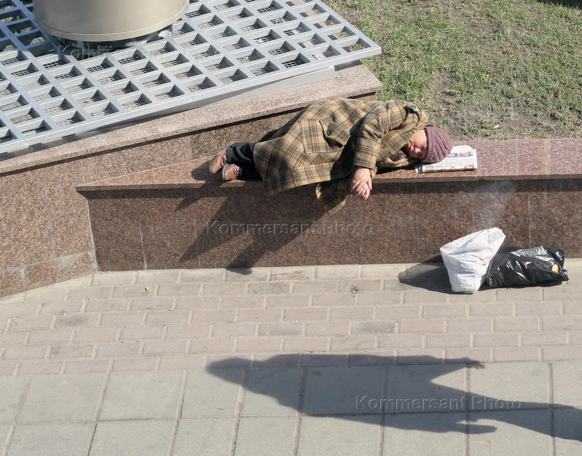 Жанровая фотография. Женщина бомж спит на гранитном парапете.