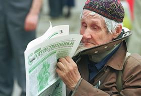 Один из участников читает газету "Соотечественники" во время проведения традиционного общегородского…