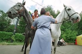 Всадники на лошадях выясняют отношения со стражем порядка (женщиной-милиционером) во время…