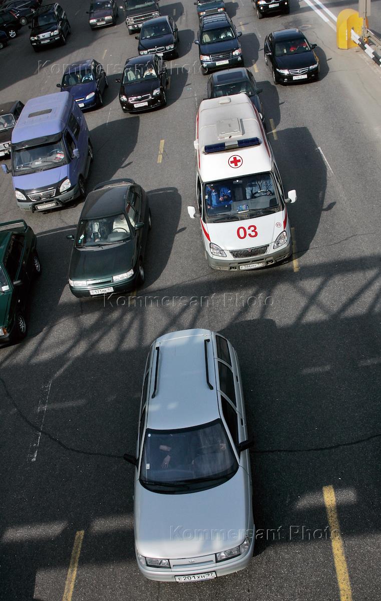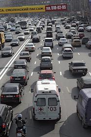 Машина "Скорой помощи" в автомобильных пробках в Москве.