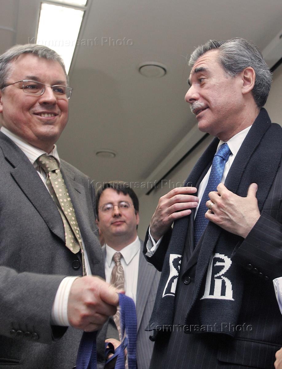 Министр торговли США Карлос Гутиеррес (слева) и посол США в России Уильям Бернс (справа) во время…