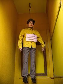 Центральный офис компании "Евросеть" на Тверской улице. Чучело повешенного человека и надпись у него…