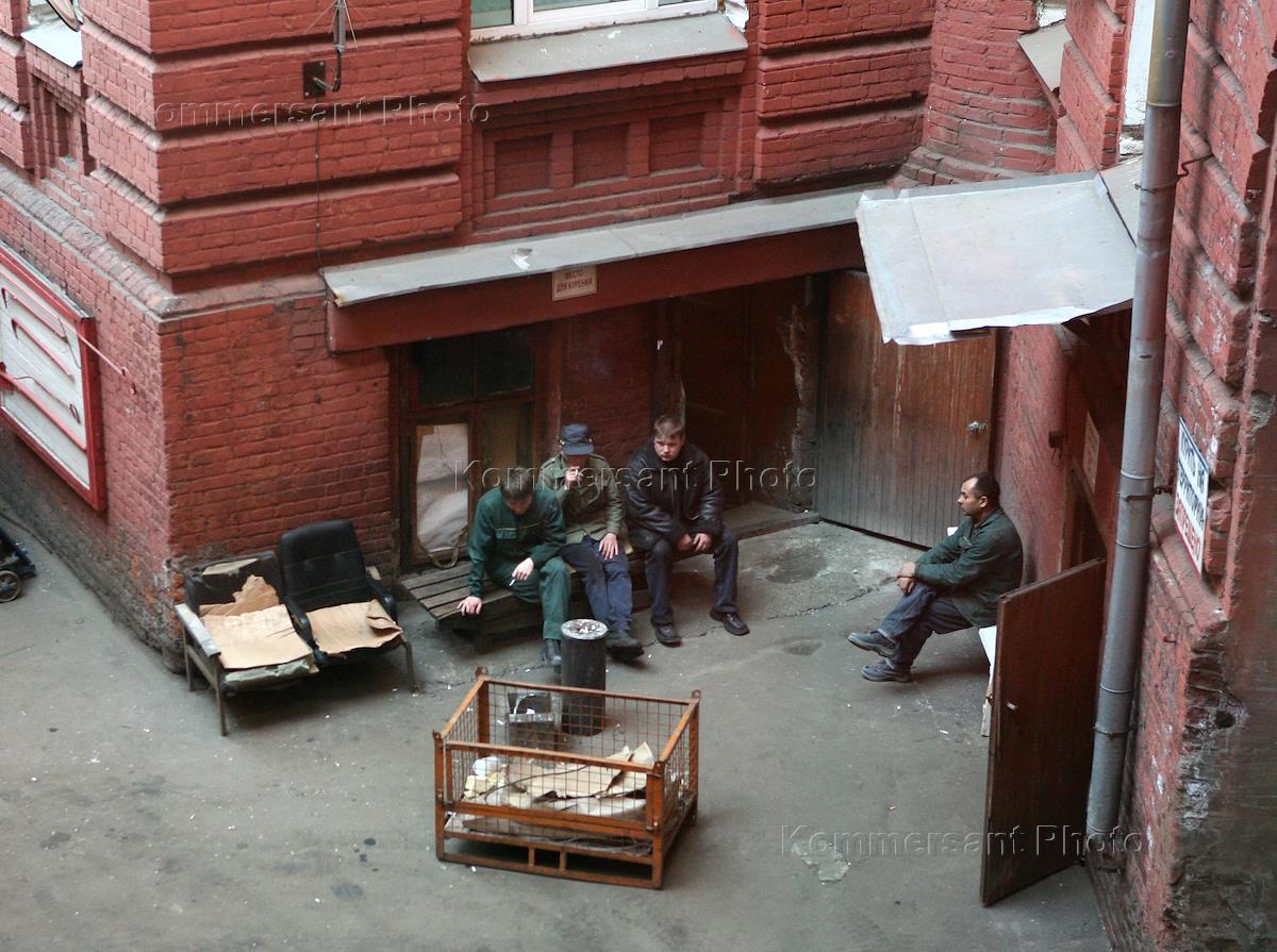 Кондитерская фабрика "Красный Октябрь". Рабочие отдыхают во дворе фабрики.