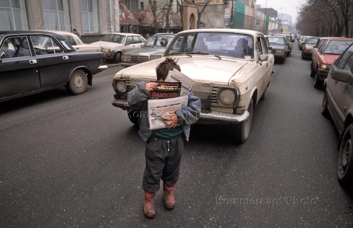 Ребенок, торгующий газетами и журналами, на проезжей части улицы.