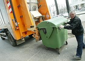 Работник городского хозяйства грузит контейнер в мусоровоз.