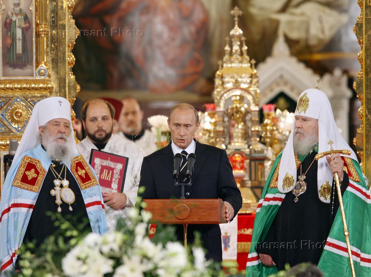 Патриарх Московский и всея Руси Алексий II (слева) и Президент России Владимир Путин (справа) на…