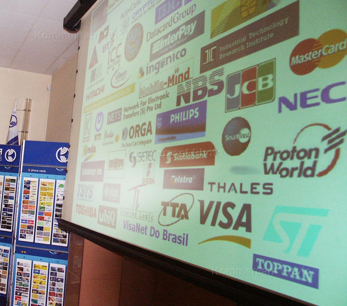 Стенд, посвященный многообразию платежных систем использующих пластиковые карты.