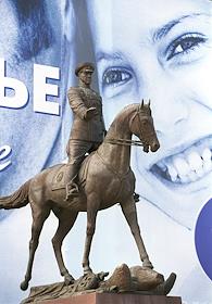 Памятник маршалу Жукову на фоне рекламного плаката крема NIVEA.